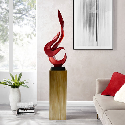 Metallic Red Flame Floor Sculpture With Wood Stand, 65" Tall